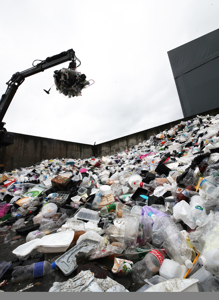 코로나19 장기화로 일회용품 사용이 증가하고 있는 24일 경기 수원시 영통구 수원시자원순환센터에서 관계자들이 플라스틱 재활용 쓰레기를 정리하고 있다.