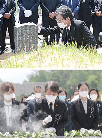 5.18민주화운동 40주년을 하루 앞둔 17일 오전 광주 북구 국립 5.18민주묘지에서 미래통합당 유승민 의원이 희생자 묘지를 참배하고 있다. 국민의당 안철수 대표 이날 광주 북구 국립 5.18민주묘지에서 열린 추모식에서 분향하고 있다.