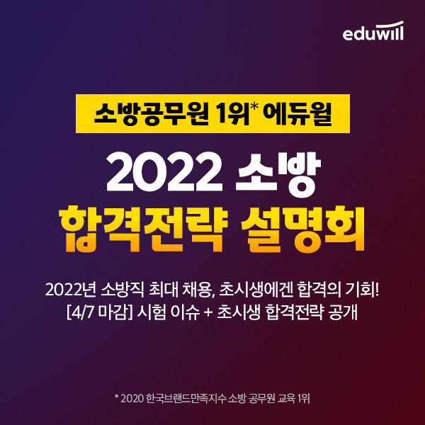 이외 에듀윌 소방은 4월7일 오후 2시 진행되는 ‘2022 소방 합격전략 설명회’를 소방꿈, 닥공사 등 각종 소방 취업 커뮤니티에 소문내 준 분들에게 경품을 제공 중이다.