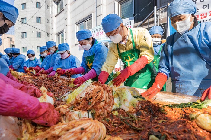 서울 광진구 새마을부녀회가 11일 지역내 소외계층을 위한 ‘사랑의 김장 담가드리기’ 행사를 개최해 배추 3000포기와 무 2000개로 김장김치를 담갔다. 사진은 이날 행사에 참여한 김선갑 구청장(오른쪽에서 두 번째)과 봉사자들이 김치를 만들고 있는 모습. (사진제공=광진구청)