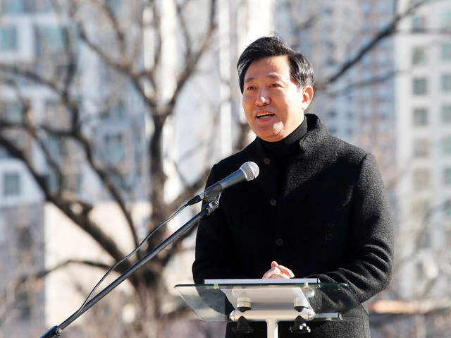 국민의힘 오세훈 전 서울시장이 17일 오전 서울 강북구 북서울꿈의숲에서 서울시장 보궐선거 출마 선언을 하고 있다.