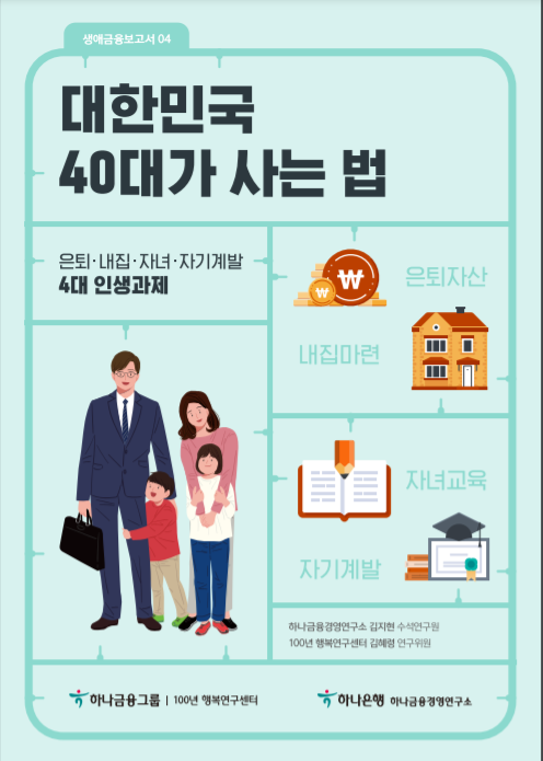 센터는 하나금융경영연구소와 함께 40대가 당면한 4대 인생과제로 ▲자녀교육, ▲주거 안정성, ▲은퇴자산 마련, ▲자기계발을 제시했다. 40대는 가장 왕성하게 사회활동을 하는 동시에 가정에서는 학령기에 접어든 미래세대를 길러낸다.