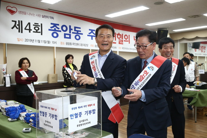 서울 성북구 종암동 주민자치회가 최근 동주민센터에서 '제4회 종암동 주민 헌혈의 날' 행사를 개최했다. 이날 행사에는 주민 250여명이 참여했다. 사진은 행사에 참석한 이승로 구청장(가운데)과 이병한 주민자치회장이 헌혈증을 기부하는 모습. (사진제공=성북구청)