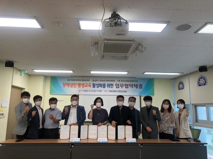 ▲ 목포시장애인종합복지관이 국립목포대학교 평생교육원과 장애인 평생교육 활성화를 위한 업무협약을 체결했다. |