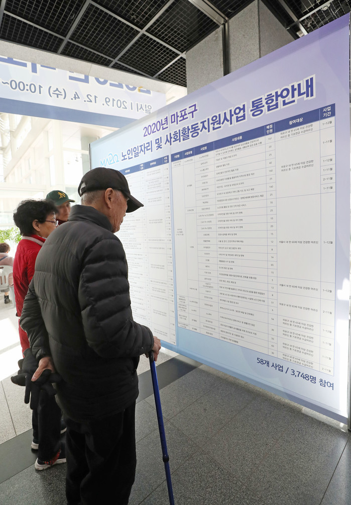4일 오후 서울 마포구청에서 열린 '2020년 노인일자리 박람회'에서 노인 구직자들이 안내문을 살펴보고 있다.