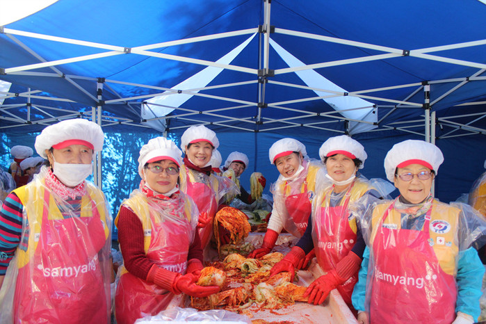 대한적십자사 봉사회 동작지구협의회가 최근 대한적십자사 서울시지사 남부봉사관에서 동작구·관악구 취약계층 200가구에 전달할 김장김치 1600kg을 담갔다. 삼양그룹의 후원으로 진행된 이번 봉사활동은 겨울 동안 지역 결식아동, 저소득층 가정 등 어려운 가족의 밥상을 든든하게 책임질 김장김치를 전달하기 위해 마련됐다. 사진은 봉사원들이 김장을 하고 있는 모습. (사진제공=대한적십자사 서울시지사)