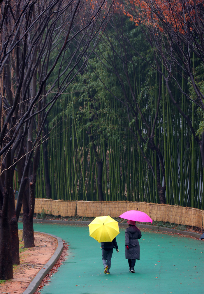 봄을 재촉하는 비가 내리는 12일 오전 광주 서구 5.18 기념공원에서 우산을 쓴 시민들이 산책을 즐기고 있다.