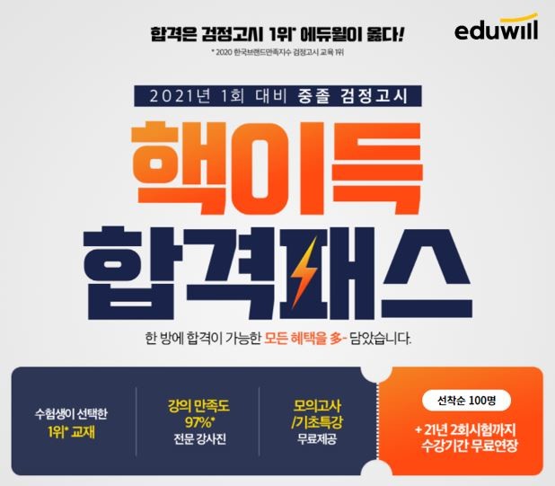[시민일보 = 여영준 기자] 종합교육기업 에듀윌이 오는 2021년 1회 중·고졸 검정고시 시험 대비 ‘핵이득 합격패스’를 모집 중이다.