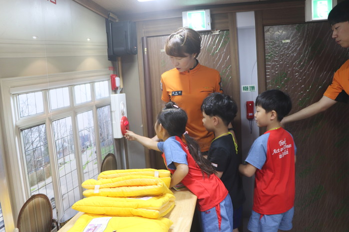 인천송도소방서가 17일 본서 차고 앞에서 SLP유치원 원생 60여명을 대상으로 이동안전체험차를 이용해 소방안전교육을 실시했다. 이날 아이들은 다양한 재난상황 재연 및 체험을 통해 대처방법 등을 배웠다. 사진은 안전 체험을 하는 아이들의 모습. (사진제공=송도소방서)
