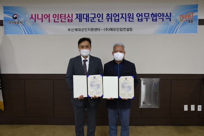 부산지방보훈청(청장 권율정) 제대군인지원센터는 27일 ㈜에듀인잡컨설팅(부산 남구 수영로 소재)과 시니어 제대군인 취업지원을 위한 업무협약을 맺었다.