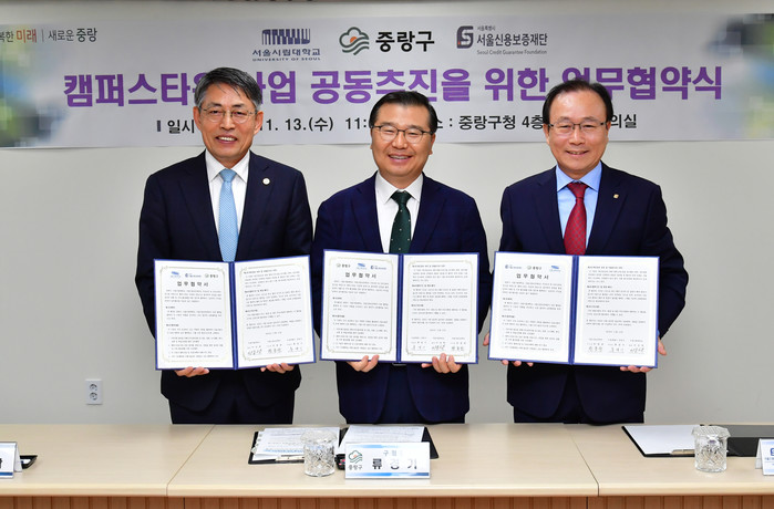 [시민일보 = 여영준 기자] 서울 중랑구(구청장 류경기)가 최근 구청 4층 다목적회의실에서 서울시립대학교, 서울신용보증재단과 함께 ‘서울시 캠퍼스타운 사업’ 공동추진을 위한 업무협약을 체결했다.