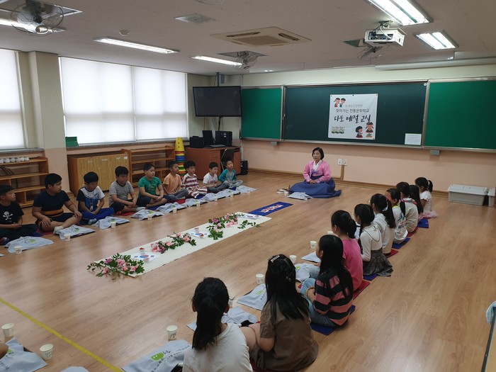 인천 동구 화도진문화원은 최근 영화초등학교를 끝으로 지역내 5개 초등학교 500명을 대상으로 한 ‘찾아가는 전통문화학교’를 성료했다. 프로그램은 다도체험 및 예절교육, 달팽이놀이, 비사치기 등 놀이체험 등으로 진행됐다. 사진은 다도체험 모습. (사진제공=동구청)