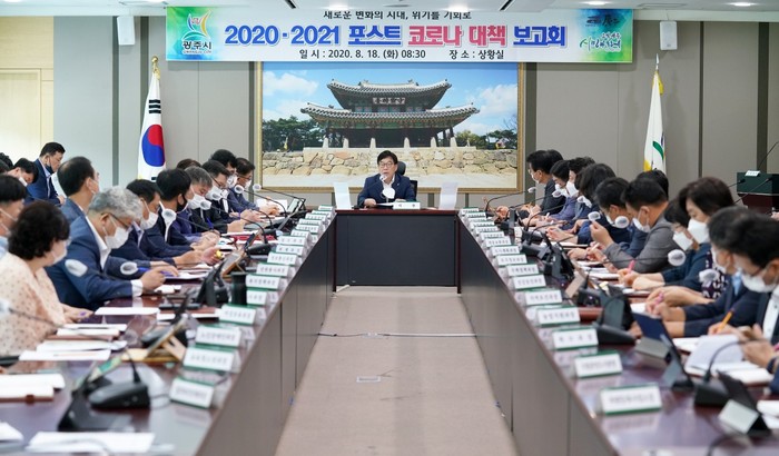 경기 광주시는 18일 시청 상황실에서 ‘2020·2021 포스트 코로나 대책 보고회’를 개최했다. 보고회는 비대면 행정 및 지역경제 활성화 분야 등과 정책과제를 발표했으며 추진방향 및 중점 추진내용 등에 대해 심도 있게 논의했다. 사진은 신동헌 시장이 보고회를 주재하고 있는 모습. (사진제공=광주시청)