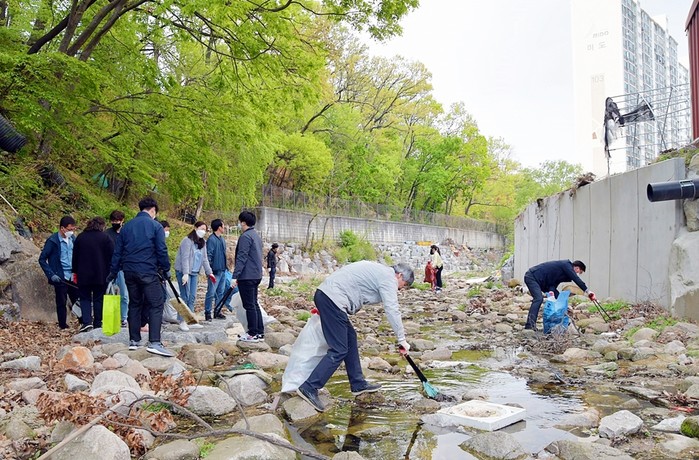 경기 의정부시 호원2동 행정복지센터가 최근 하천정비가 필요한 지역내 회룡천 상류 구간에 대해 새봄맞이 대청소를 실시했다. 이번 대청소는 코로나19가 장기화돼 시민단체의 봉사활동에 차질이 생기면서 하천 정화활동에 대한 공백을 메우고자 실시한 것이다. 사진은 참여자들이 쓰레기를 수거하고 있는 모습. (사진제공=의정부시청)
