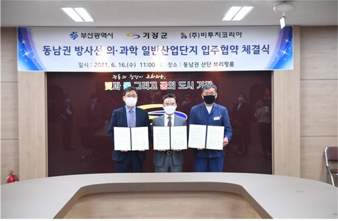 부산시(시장 박형준)는 6월 16일 기장군 동남권 방사선 의ㆍ과학 산업단지 현장에서 파워반도체 및 의료기기 제조기업인 ㈜비투지코리아, 기장군과 파워반도체 웨이퍼 신설공장 건립을 위한 투자 MOU를 체결했다고 밝혔다.
