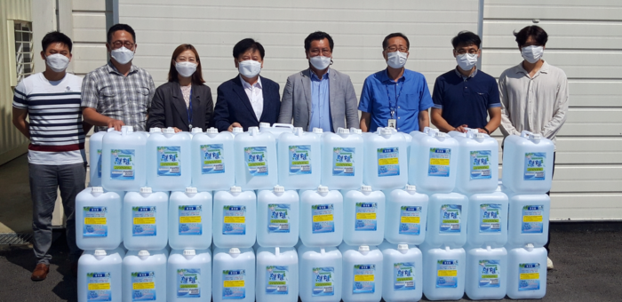 ▲ ㈜해양에코그린 신안에 살균소독수 기부(출처=신안군) |