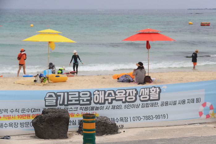 제주도 내 해수욕장이 일제히 개장한 1일 오후 제주시 구좌읍 월정해수욕장에 방역 수칙 준수를 당부하는 현수막이 걸려 있다.