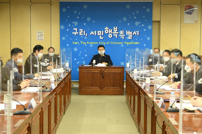 경기 구리시는 16일 농식품 관련 첨단기술 기업 유치 전략을 모색하기 위한 '푸드테크밸리 사업타당성 및 사업화 방안 수립 용역' 착수보고회를 열었다. 보고회에서는 푸드테크 관련 기업의 시 입주의향 파악을 위한 수요조사 수행 방안 등과 참석자 간 질의 응답과 토론이 이어졌다. 사진은 안승남 시장(가운데)이 회의를 주재하고 있는 모습. (사진제공=구리시청)