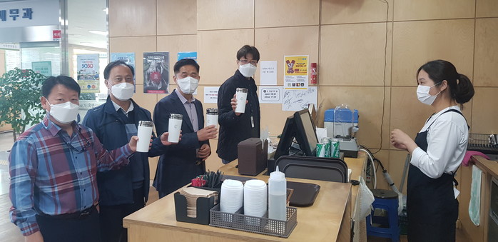 경기 수원시 권선구가 사무실내 종이컵 등 1회용 컵을 없애고 수원 환경컵 ‘Cupid(큐피드) 사용 캠페인’에 동참한다. 큐피드는 수원시에서 1회용 컵을 줄이기 위해 시행하고 있는 사업이다. 사진은 3일 구청 직원들이 텀블러를 들고 기념촬영을 하는 모습. (사진제공=권선구청)