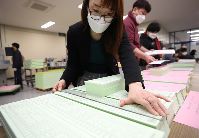 31일 오후 대구시 달서구의 한 인쇄업소에서 인쇄된 4.15 총선 비례대표 투표용지가 48.1cm의 길이를 보이고 있다.