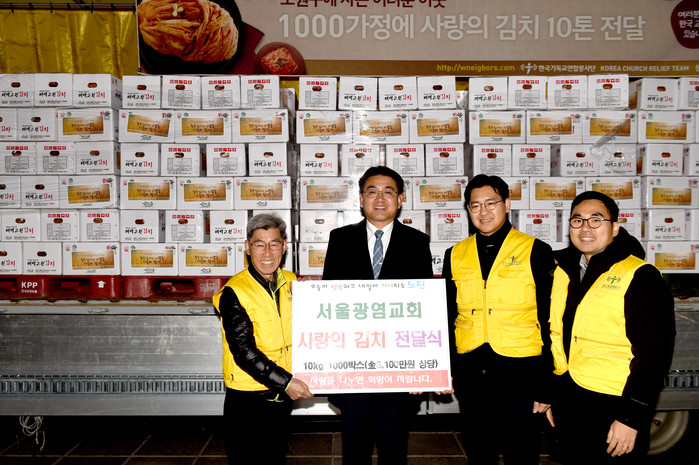 서울 노원구는 20일 ‘서울광염교회 사랑의 김치 전달식’을 개최, 서울광염교회로부터 저소득가구를 위한 김치 10kg 1000상자(3100만원 상당)를 전달받았다. 사진은 오승록 구청장(왼쪽에서 두 번째)과 교인들이 기념촬영을 하는 모습. (사진제공=노원구청)