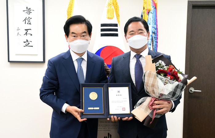 안병용 경기 의정부시장은 23일 이용걸 의정부시자원봉사센터 이사장에게 자원봉사 유공 경기도지사 표창을 전수했다. 이 이사장은 그동안 저소득 취약계층 집수리 봉사 등 다양한 활동을 했고 현재 의정부시자원봉사센터 이사장으로 재임하면서 코로나19 극복을 위한 자원봉사활동을 펼치고 있다. 사진은 안 시장(왼쪽)과 이 이사장이 기념촬영을 하는 모습. (사진제공=의정부시청)