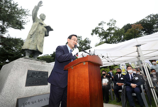 미래통합당 주호영 원내대표가 19일 서울 종로구 이화장에서 열린 이승만 전 대통령 서거 55주기 추모식에서 추모사를 하고 있다.