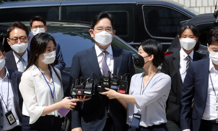 불법 경영승계 의혹을 받는 이재용 삼성전자 부회장이 8일 오전 서초구 서울중앙지방법원에서 열린 영장실질심사(구속 전 피의자 심문)에 출석하며 취재진 질문을 받고 있다.