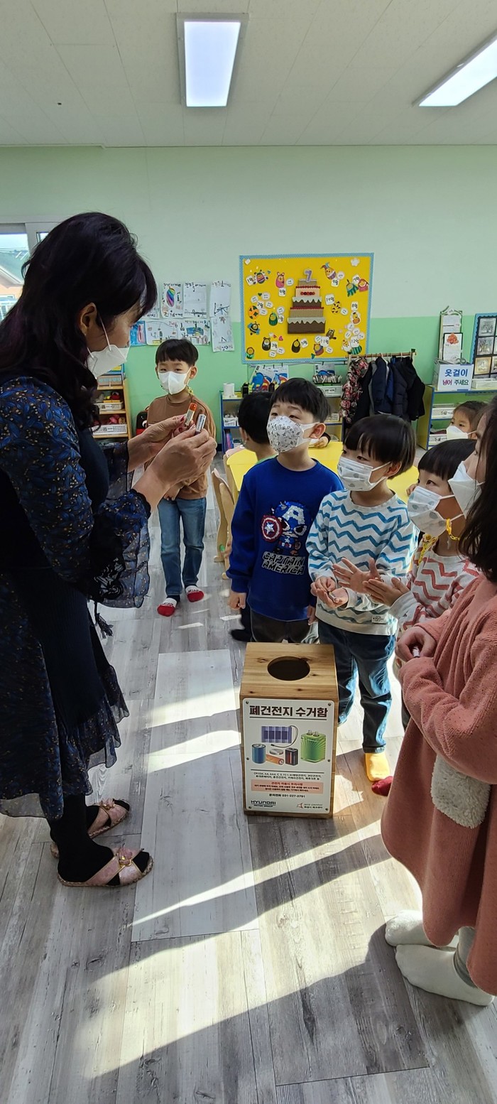 경기 화성시에코센터가 최근 어린이들의 올바른 건전지 사용법과 안전한 분리배출 교육을 위해 지역내 어린이집에 폐건전지수거함을 배포했다. 사진은 한 어린이집에서 원아들에게 폐건전지 분리배출 교육을 하고 있는 모습. (사진제공=화성시청)