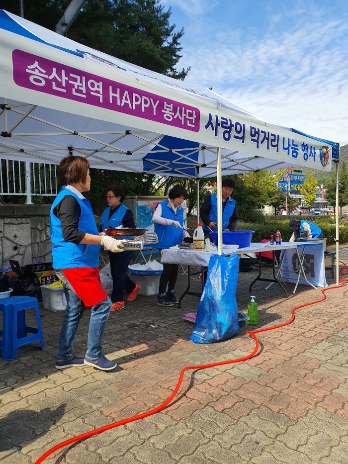 경기 의정부시 송산권역 Happy매니저는 최근 청사로47번길 일대의 상가에서 근무하는 경비원, 미화관리원, 주차관리원분들과 주변의 폐지 줍는 노인 50여명에게 따뜻한 떡국, 손수 만든 반찬 등 점심식사 나눔행사를 개최했다. 사진은 참여자들이 음식을 만들고 있는 모습. (사진제공=의정부시청)
