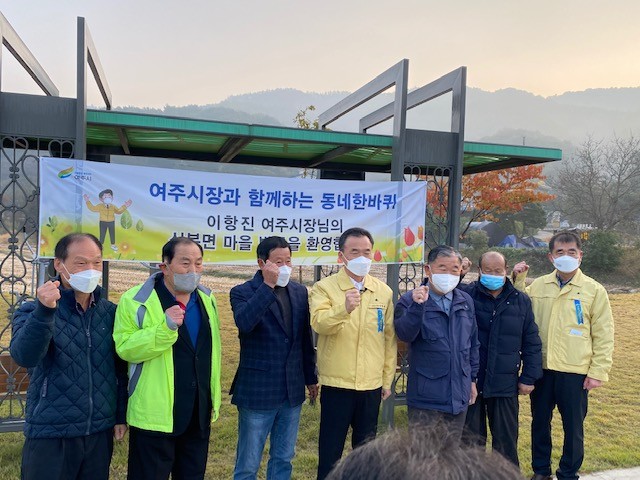 이항진 경기 여주시장은 최근 ‘동네한바퀴’로 산북면 송현리를 찾아 하천변을 걸으면서 마을 관계자들과 담소를 나눴다. 사진은 이날 이 시장(가운데)이 기념촬영을 하는 모습. (사진제공=여주시청)