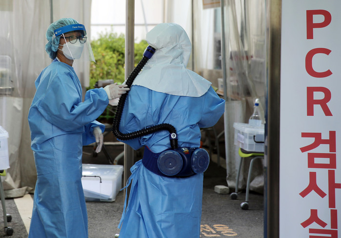 전국 곳곳에 폭염특보가 내려진 20일 대전 서구 건양대병원 선별진료소에서 의료진이 코로나19 검사를 위한 준비를 하고 있다.