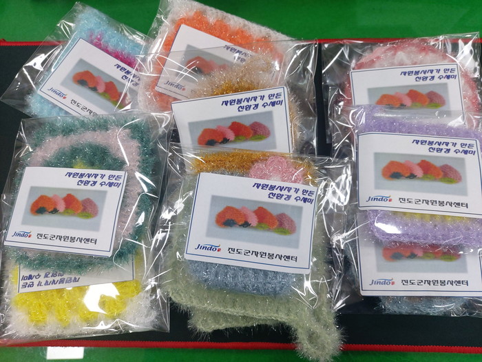 | ▲ 자원봉사자들이 직접 만든 친환경 수세미. (사진제공=진도군청) |