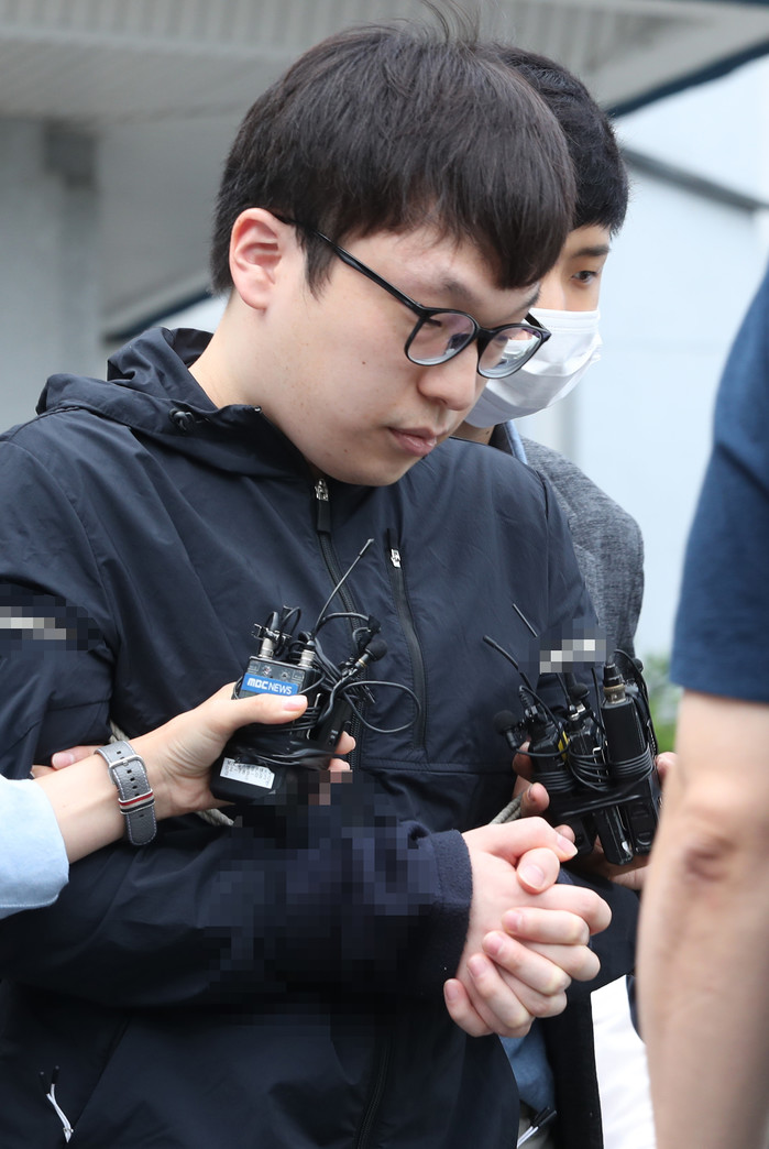 '조주빈 성 착취 공범' 남경읍이 15일 오전 서울 종로경찰서에서 서울중앙지검으로 송치되고 있다.