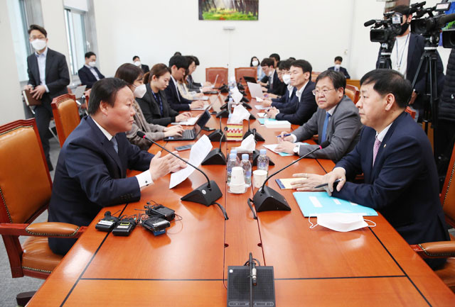 미래통합당 소속 김재원 예결위원장(왼쪽)이 지난 24일 국회에서 구윤철 기획재정부 2차관(오른쪽)과 2차 추경안 관련 논의를 하고 있다.