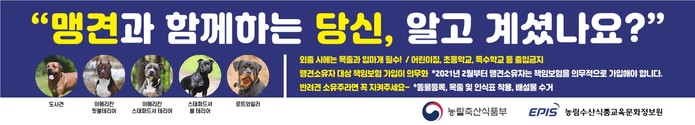 한편, 의령군 관계자는 “법에 명시된 5가지 품종의 맹견은 크기와 무관하게 책임보험에 가입해야 하며, 책임감 있는 반려문화를 조성하기 위해 맹견의 소유자는 꼭 맹견 책임보험에 가입하시길 바란다.”라고 당부했다.
