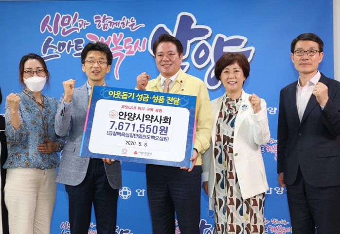 경기 안양시는 최근 시 약사회로부터 코로나19로 어려움에 처한 소상공인과 취약계층을 위한 성금 767만1550원을 전달 받았다. 이날 성금 전달식에는 최대호 시장을 비롯해 시 약사회 관계자 등이 참여했다. 사진은 최 시장(가운데)과 관계자들이 기념촬영하는 모습. (사진제공=안양시청)