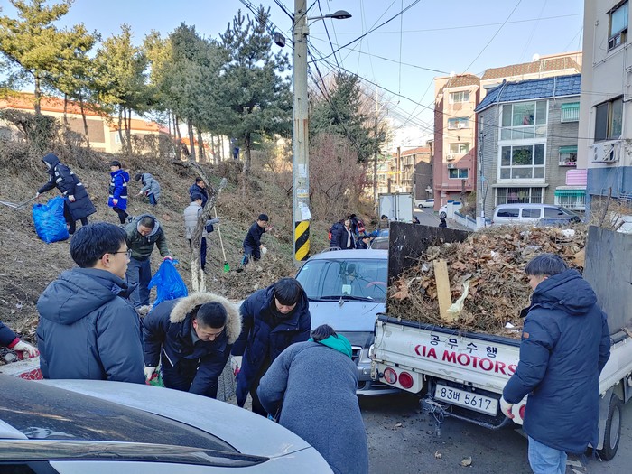 인천 부평구 부개1동 행정복지센터는 5일 센터 앞에서 ‘우리 동네 마을 가꾸기’ 사업에 참여하는 지역내 초등학교 학생들의 아버지들이 참석한 가운데 ‘아버지 보안관 봉사단’ 발대식을 개최했다. 사진은 환경 정화활동을 하는 모습. (사진제공=부평구청)