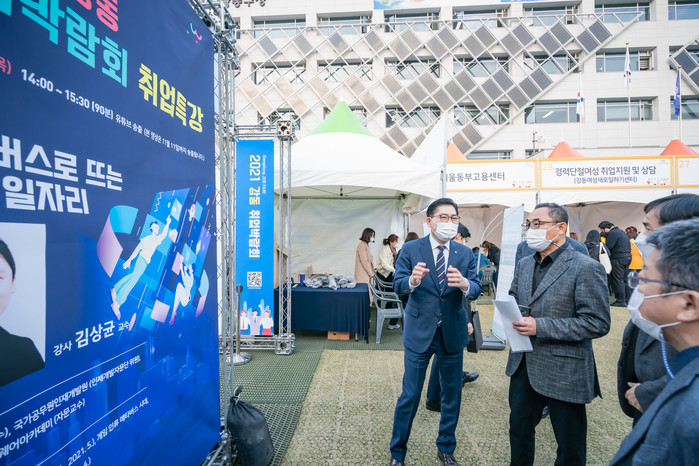 서울 강동구는 4일 ‘2021 강동 취업박람회’를 성공리에 마무리했다. 이번 박람회에는 50여개의 기업이 참여했으며 현장에서 직접 면접을 보는 채용관과 키오스크를 활용한 비대면 채용 부스를 병행해 운영했다. 사진은 박람회 현장을 방문한 이정훈 구청장(왼쪽)이 행사장을 둘러보고 있는 모습. (사진제공=강동구청)
