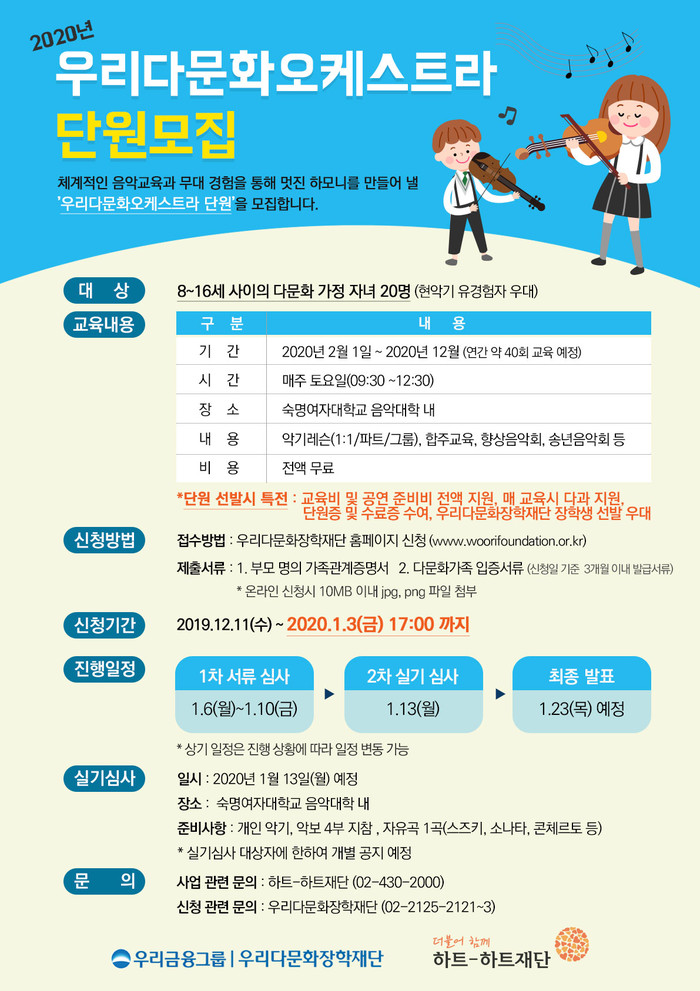 [시민일보 = 황혜빈 기자] 우리금융그룹 우리다문화장학재단은 ‘우리다문화오케스트라’ 단원을 오는 2020년 1월3일까지 모집한다고 11일 밝혔다.