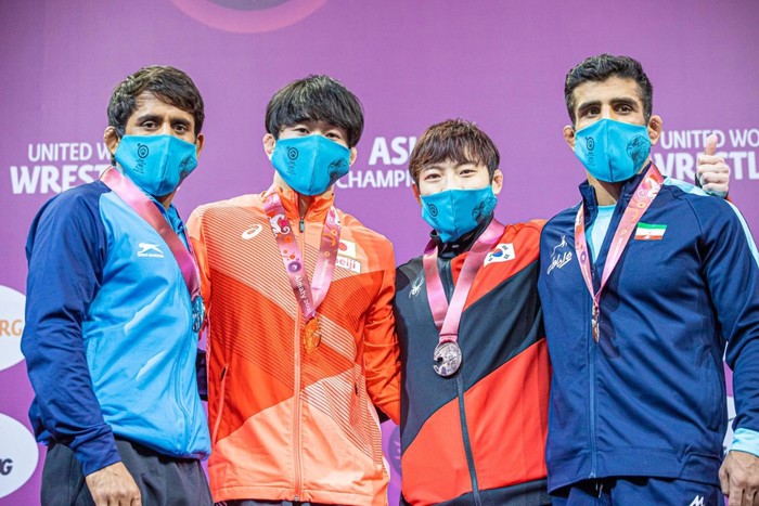 서울 구로구 레슬링팀 정용석 선수가 지난 12~17일 카자흐스탄 알마티에서 열린 2021년 아시아시니어선수권대회에 자유형 65kg급으로 출전해 3위를 차지했다. 사진은 정 선수(오른쪽 두 번째)가 기념촬영을 하고 있는 모습. (사진제공=구로구청)