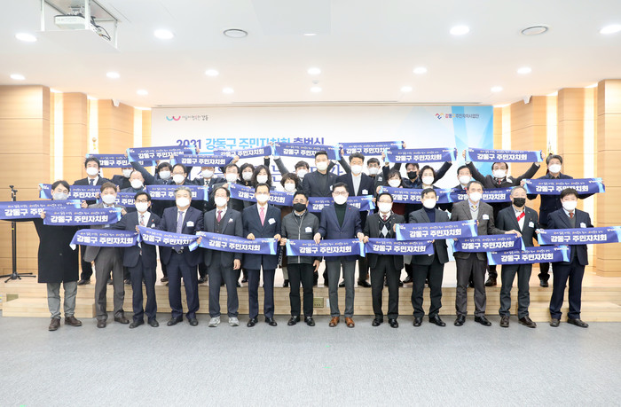 이정훈 강동구청장이 최근 강동구 주민자치회 출범식에 참석했다. 시범사업으로 5개동에서 진행되던 서울형 주민자치회는 올해 전동으로 확대 실시된다. 사진은 출범식에서 이 구청장(앞줄 가운데)이 17개동 주민자치회 대표 및 관계자들과 기념촬영을 하는 모습. (사진제공=강동구청)