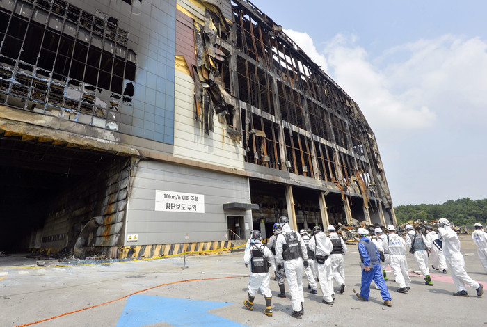 경기 이천시 쿠팡 덕평물류센터 화재 현장에서 29일 오전 경찰과 경기도소방재난본부, 국립과학수사연구원 등 관계자들이 화재 원인을 찾기 위한 합동 감식을 하고 있다.
