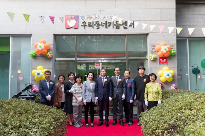 30일 김수영 서울 양천구청장이 ‘양천1호점 우리동네 키움센터 개소식’에 참석했다. 우리동네 키움센터는 학교가 끝난 후 돌봄이 필요한 초등학생에게 학습지원, 체험활동, 체육·예술 프로그램 등의 맞춤형 돌봄 서비스를 제공하기 위한 공간이다. 사진은 서 현판 제막 후 기념사진을 찍고 있는 김 구청장(왼쪽에서 다섯 번째)의 모습. (사진제공=양천구청)