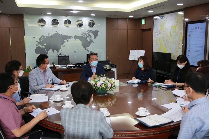 경기 수원시 장안구는 2~6일 이범선 구청장 취임에 따른 각 부서 주요업무 추진상황을 점검하고, 앞으로의 구정 추진방안 등을 논의하기 위한 주요업무보고회를 개최했다. 사진은 이 구청장(가운데)이 직원들과 회의하는 모습. (사진제공=장안구청)