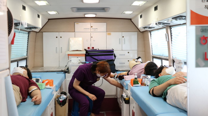 경기 안양시청소년재단 임직원들이 코로나19 장기화에 따른 혈액 수급 부족 해결을 돕기 위해 최근 '사랄의 생명나눔 헌혈릴레이'에 동참했다. 이날 헌혈은 만안청소년수련관을 찾은 한마음혈액원 헌혈버스내에서 진행됐다. 사진은 직원들이 헌혈을 하는 모습. (사진제공=안양시청소년재단)