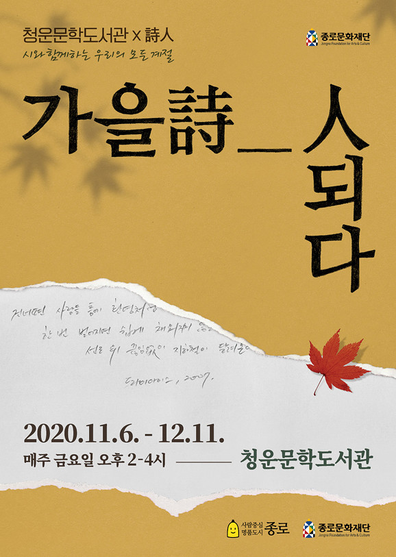 한편 청운문학도서관(종로구 자하문로36길 40)에서는 오는 12월11일까지 매주 금요일 오후 2시에 송승환 시인과 함께하는 가을詩_人되다, ’시와 놀다‘ 프로그램을 진행한다.