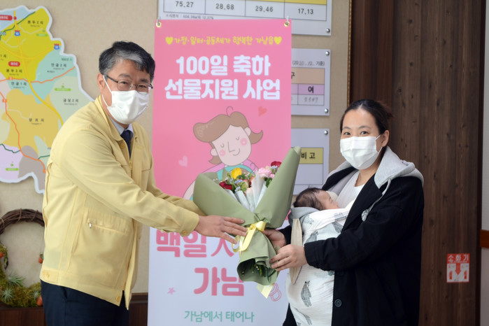 경기 여주시 가남읍 지역사회보장협의체는 19일 '백일人(in)가남' 지원사업의 첫 번째 대상자를 축하하고 기념하기 위한 백일 축하 행사를 진행했다. 사진은 기탁식에서 꽃다발과 상품권을 받고 있는 아기와 엄마의 모습. (사진제공=여주시청)