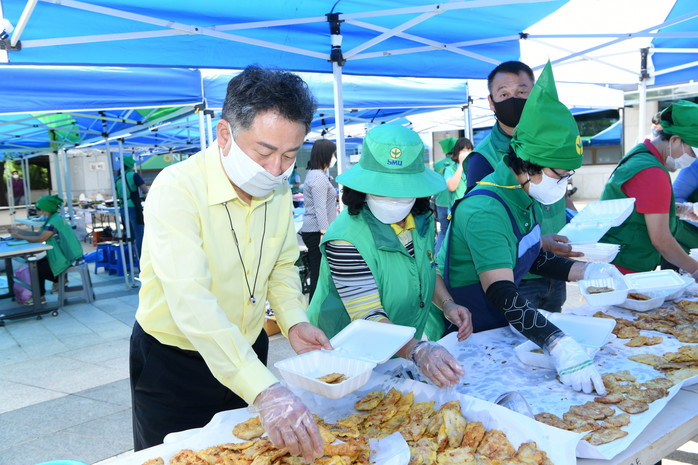 경기 구리시는 24일 구리시새마을회 주관으로 구리시청 광장에서 추석맞이 이웃사랑 송편과 전 만들기 행사를 열었다. 이날 만든 송편과 전은 지역내 8개동 홀몸노인 및 어려운 이웃에게 포장해 전달될 예정이다. 사진은 행사에서 안승남 시장(왼쪽)이 전을 포장하고 있는 모습. (사진제공=구리시청)