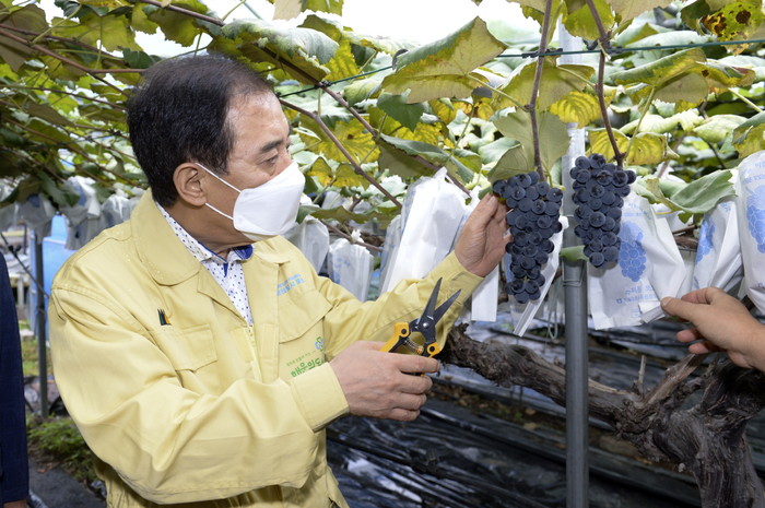 박윤국 경기 포천시장이 포천 포도가 본격 수확을 시작한 가운데 최근 소흘읍의 한 포도 농가를 방문해 수확을 축하하고 격려했다. 사진은 박 시장이 포도 농가에서 포도를 수확하고 있는 모습. (사진제공=포천시청)